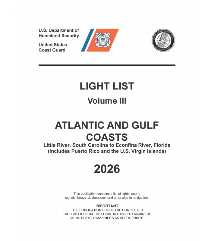 The USCG Light List is published in seven volumes and contains lights and other aids to navigation used for general navigation that are maintained by or under the authority of the U.S. Coast Guard and located in the waters surrounding the United States and its Territories. Each volume corresponds to a different regional area and contains more complete information on each aid to navigation than can be conveniently shown on charts. This publication and the data contained within it is maintained by the USCG and published with permission by Clipper City Publisher. New editions are published annually for each volume.