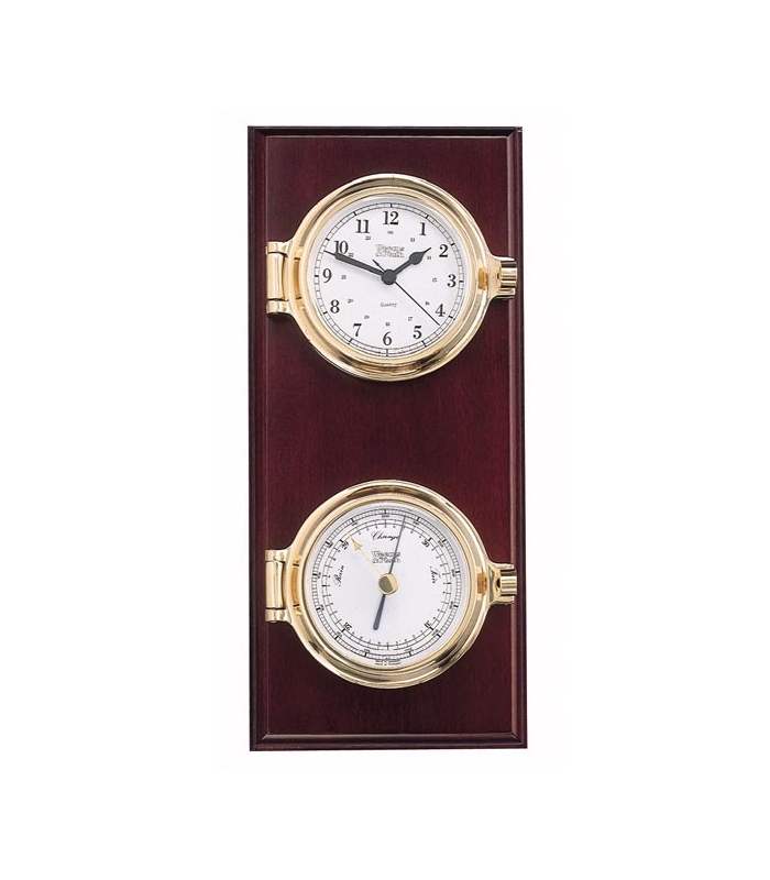 The Cutter Plaque is a solid wood mahogany finish presentation plaque on which two brass porthole style instruments are mounted vertically. The Cutter Quartz Clock is mounted above the Cutter Barometer and the stunning combination makes a perfect gift or award. The instruments featured on the Cutter Plaque can be purchased individually as well. The forged brass cases of The Cutter Quartz Clock (210500) and Barometer (210700) include front opening bezels.