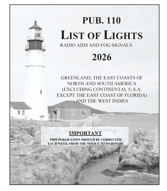 The 2026 edition of Pub. 110, List of Lights, Radio Aids and Fog Signals for the Greenland, the East Coasts of North and South America (excluding Continental U.S.A. except the East Coast of Florida), and the West Indies, cancels the previous edition of Pub. 110. This edition contains information available to the National Geospatial-Intelligence Agency (NGA) up to 15 February 2026.