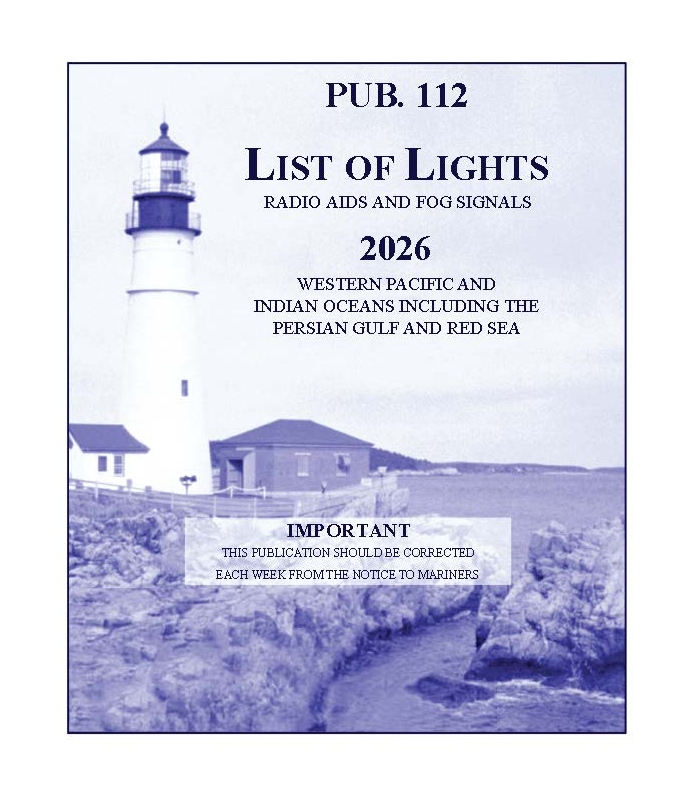 The 2026 edition of Pub. 112, List of Lights, Radio Aids and Fog Signals for the Western Pacific and Indian Oceans including the Persian Gulf and Red Sea, cancels the previous edition of Pub. 112. This edition contains information available to the National Geospatial-Intelligence Agency (NGA) up to 15 February 2026.
