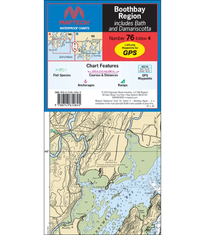 Great coverage of Boothbay and surrounding waters from Cape Small and the Kennebec River east to the Damariscotta River. Featuring waypoints, courses and distances, ramp locations, and fish species information. 24" x 36", scale 1:40,000 with insets.