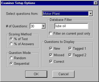 Below is the Questions window, showing 1st question of a test of 30, which have been filtered to include "lube oil," as shown in the Set up window below it. When you save a session, the window will show that name, rather than "untitled." There were 85 questions in the Motor Plant book that contained "lube oil" in the question.